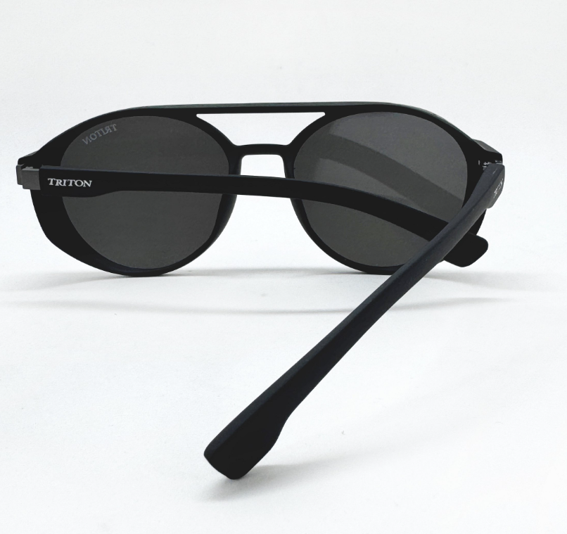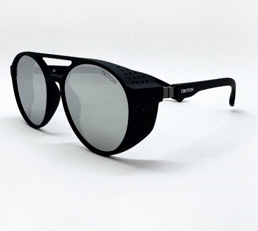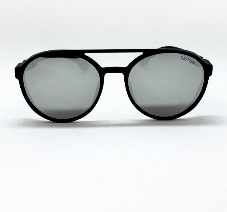 Óculos de sol Triton estilo clássico, formato redondo na cor preta. Armação em acetato e lentes na cor prata espelhada. As plaquetas são embutidas. Lentes possuem proteção 100% UVA e UVB, protegendo seus olhos contra os raios nocivos do sol e prevenindo o risco de doenças oculares.