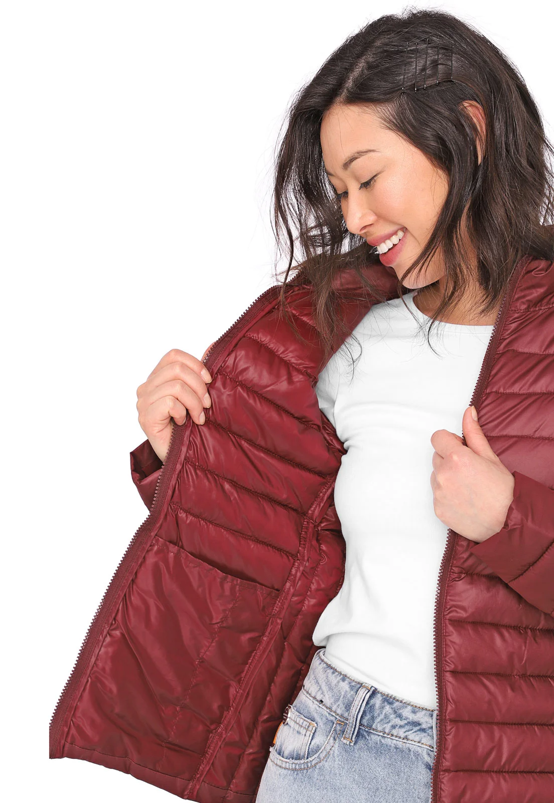 Jaqueta puffer na cor vinho.